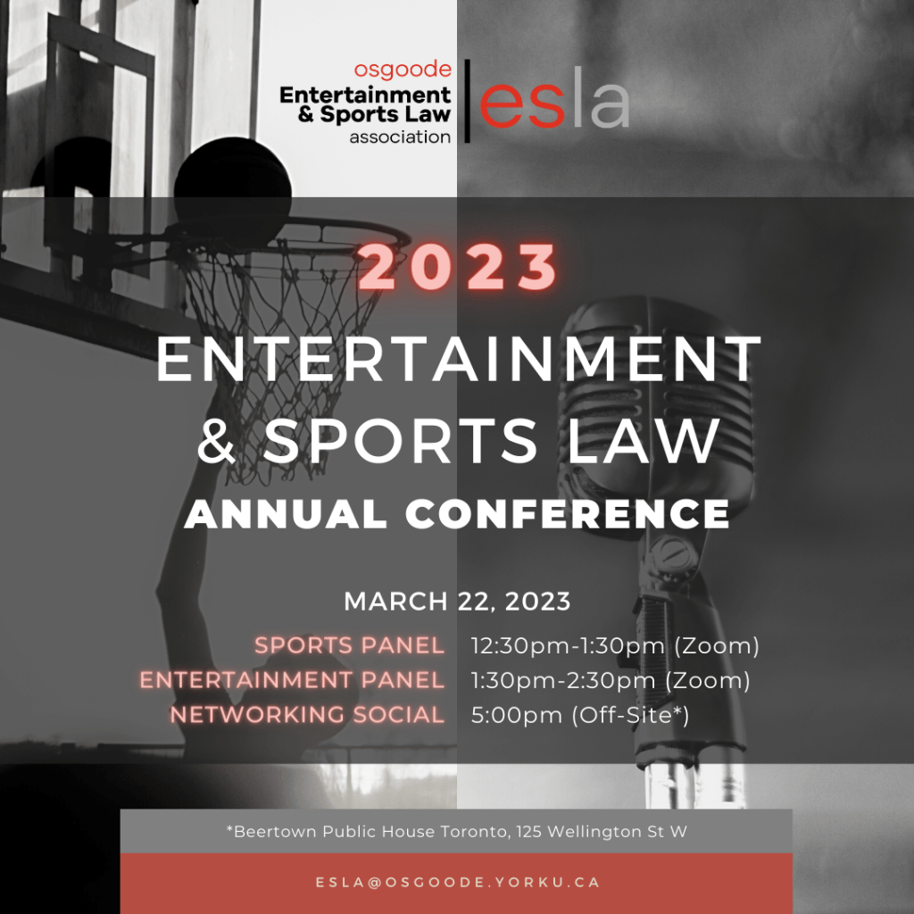 ESLA’s Annual Entertainment & Sports Law Conference is Canada’s premier student conference for aspiring industry leaders in entertainment and sports law. Our 25th annual conference will feature speakers from the legal and business side of film, television, music, and sports on March 22nd, 2023.